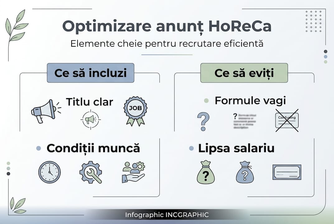 Programul flexibil și mediul dinamic sunt atuuri majore în HoReCa. Dacă oferi flexibilitate în ture, menționează-o explicit. Dacă echipa este tânără și energică, spune-o. Candidații caută nu doar un job, ci un mediu în care să se integreze natural.